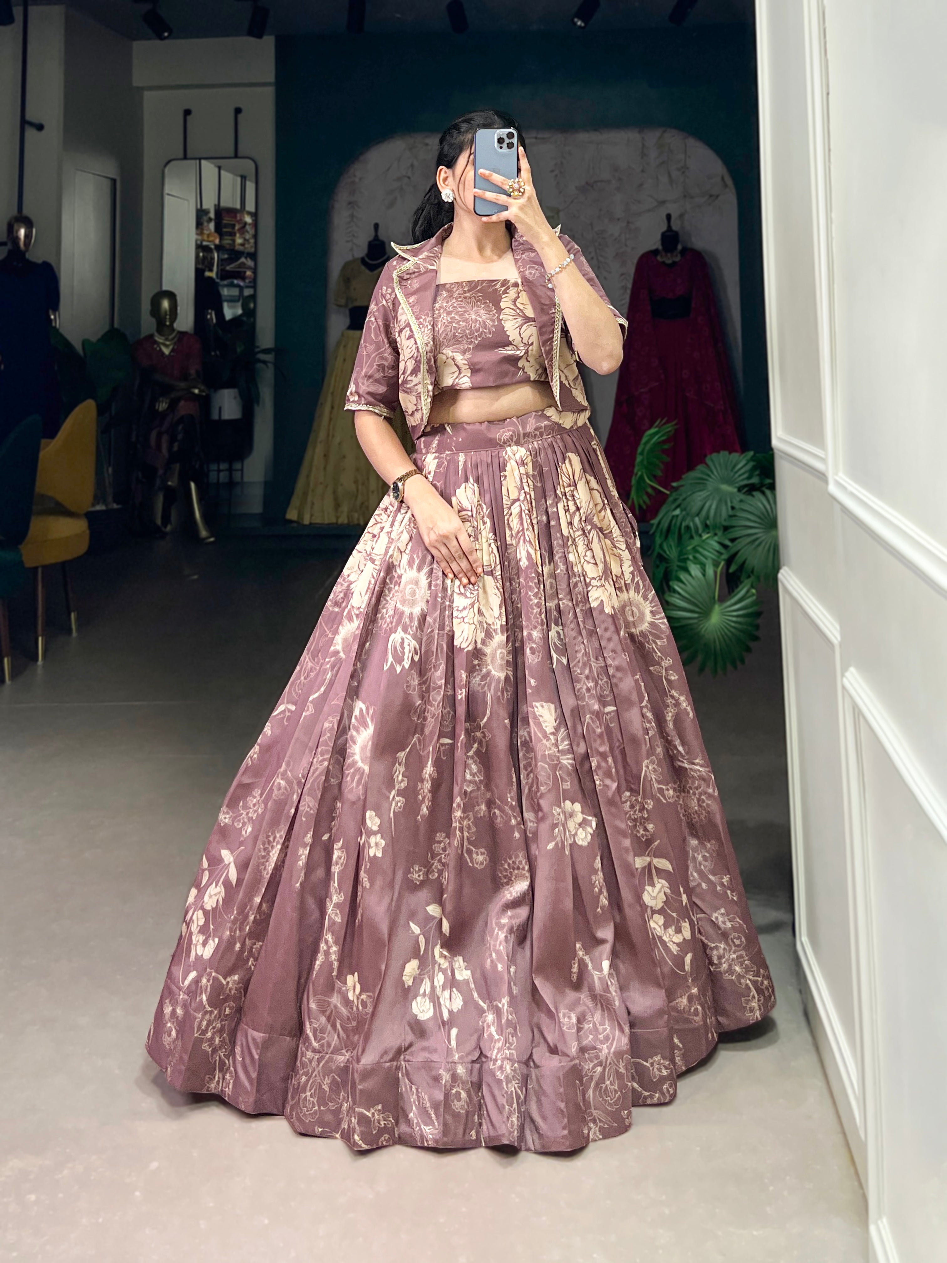 Blooming Grace in Tussar Silk – Floral Printed Lehenga Choli with Matching Koti for Festive Elegance