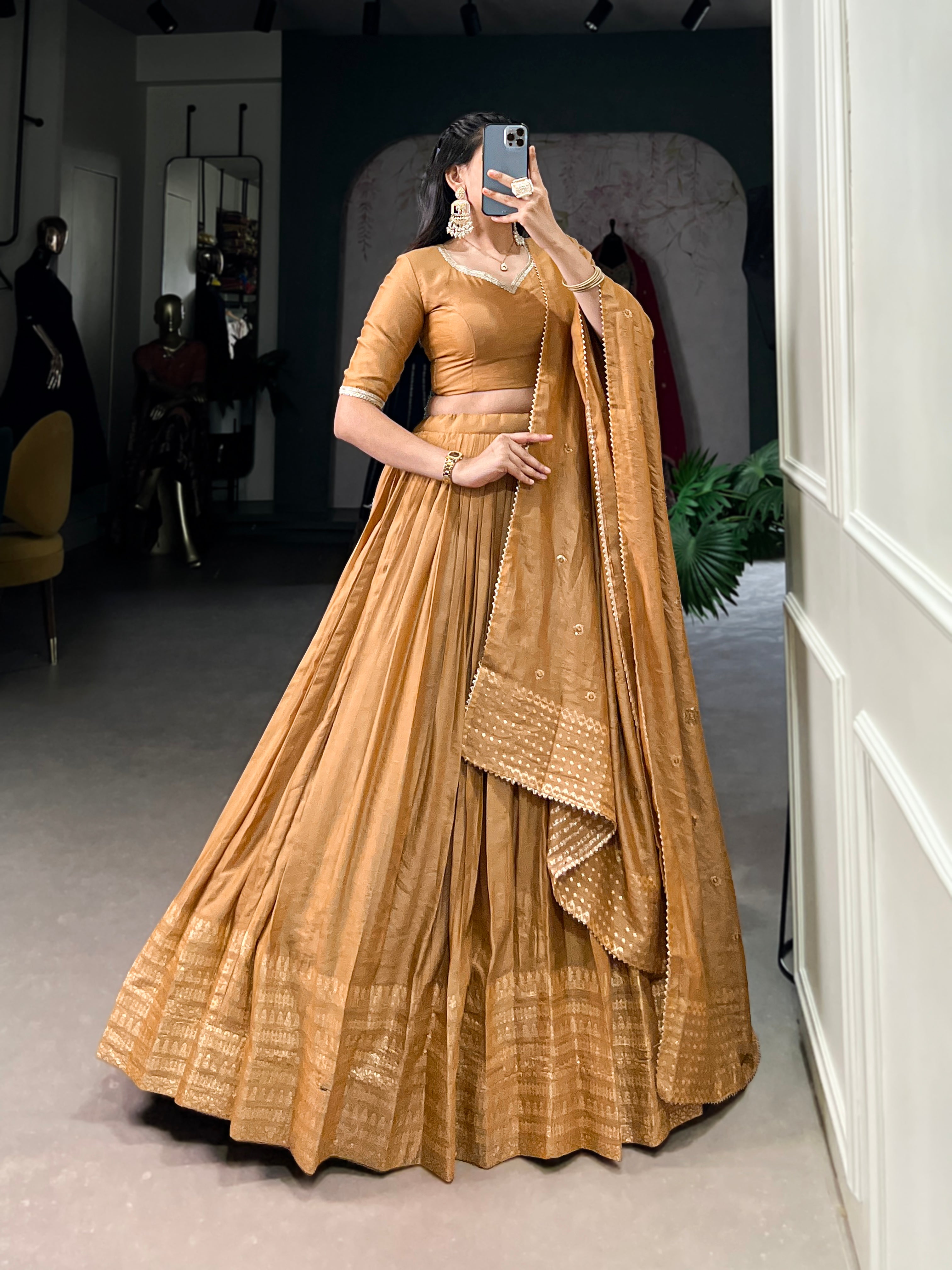 Designer Dyeable Viscose Jacquard Lehenga Choli & Dupatta Set – Sequins Embroidery & Russian Silk Dupatta Free size (42')
